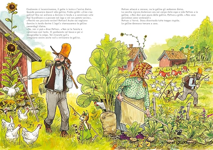 Quando Pettson ritrova una vecchia tenda da campeggio in soffitta, si ricorda di quanto era bello dormire in tenda sulle montagne. Il gatto Findus è subito entusiasta dell'idea, ma anche le galline vogliono partecipare all'impresa, e tutto si fa un po' complicato… dopo aver quasi pescato il luccio più grande del mondo, finalmente Pettson e Findus crollano a dormire, e cosa importa se la tenda è piantata soltanto in giardino? Il vicino di casa avrà qualcosa da raccontare… Età di lettura: da 5 anni.