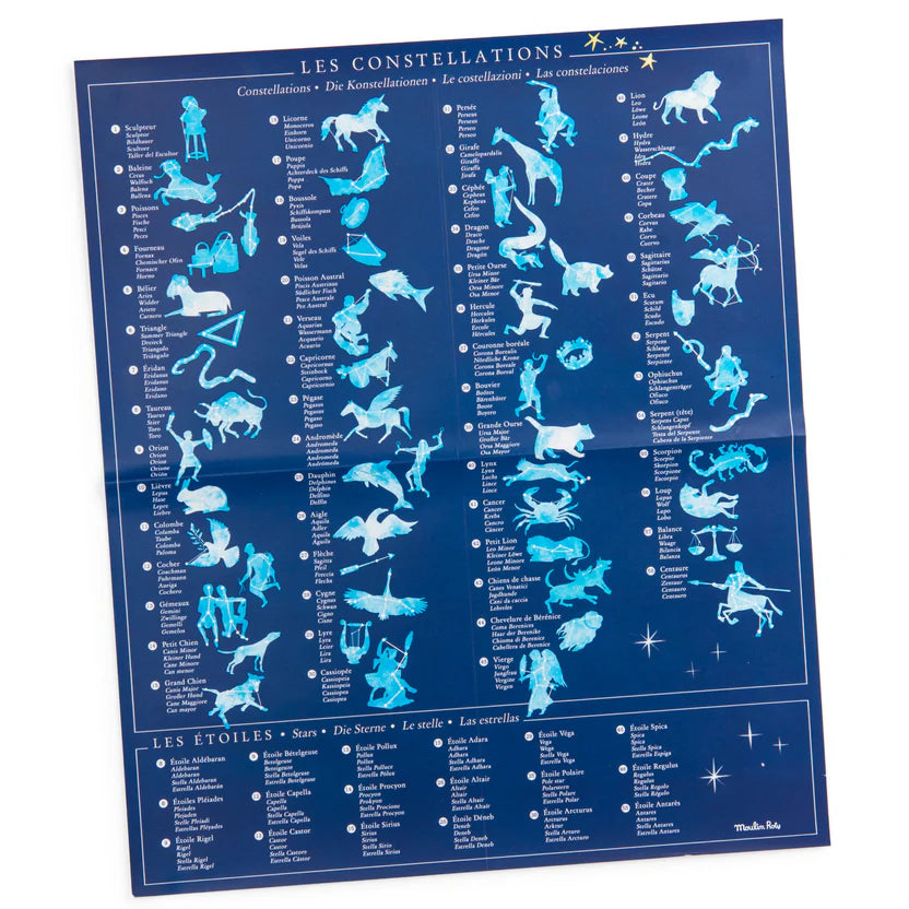 Dove si trova la costellazione della balena? Con l'aiuto dei 4 fogli di decalcomanie, degli adesivi a forma di stella fosforescente e del poster, riposiziona le costellazioni sulla mappa del cielo.
