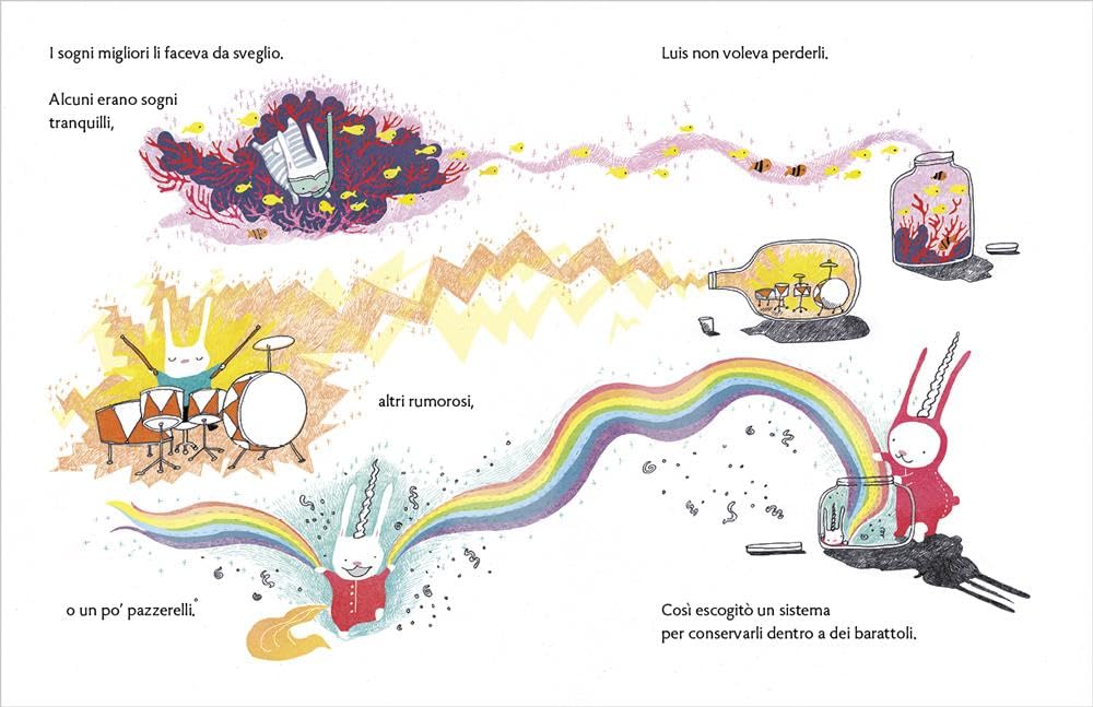 Luis colleziona sogni. Li mette in barattoli grandi e piccoli, in attesa di realizzarli. Mostra anche ai suoi amici coniglietti come conservare i desideri, così ne raccolgono tantissimi: pattinare sul ghiaccio, vedere un bruco che si trasforma in farfalla, recitare, andare sulla luna. Ma come si fa a sperare ancora se una tempesta spazza via tutti i barattoli? Un albo che con un linguaggio semplice e profondo parla ai bambini della capacità di ricominciare, della perseveranza davanti a una perdita, e di come riuscire a guardare al futuro con fiducia. Età di lettura: da 4 anni.
